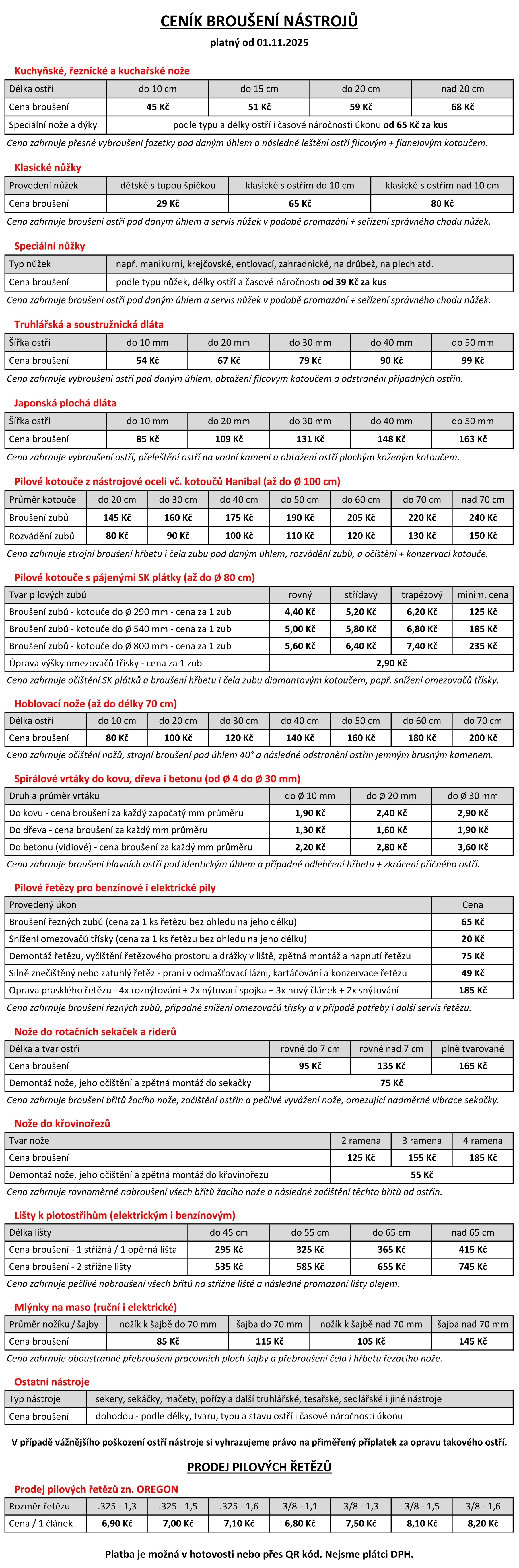 Nabízíme broušení veškerých pilových řetězů do elektrických, benzínových pil a akumulátorových pil, a to bez ohledu na typ a rozměry řetězu. K broušení využíváme dvě brusky s plně nastavitelnými úhly a kvalitní brusivo značek Oregon či Tyrolit, čímž dosahujeme velmi citlivého a jemného úběru s dlouhou životností broušeného ostří zubů.